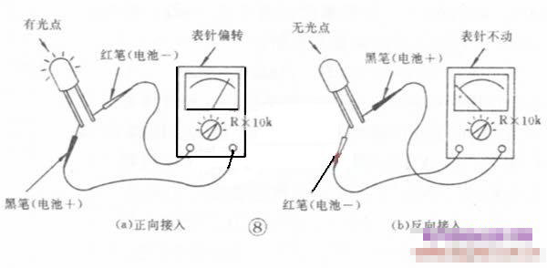 測試發(fā)光二極管的好壞,可以按照測試普通硅二極管正反向電阻的方法測試。指鐘式萬用表撥在R*100或R*1K檔,用黑表筆接發(fā)光二極管正極,紅表筆接負(fù)極,測得正向電阻應(yīng)在20=40K;用黑表筆接發(fā)光二極管負(fù)極,紅表筆接正極,測得反向電阻應(yīng)大于500K以上。用數(shù)字式萬用表撥在二極管檔,黑表筆接發(fā)光二極管正極,紅表筆接負(fù)極,阻值為無窮大。黑表筆接發(fā)光二極管負(fù)極,紅表筆接正極,發(fā)光二極管會有微亮,表示正常。測式方法如圖