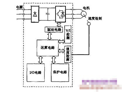 在圖 1點劃線內(nèi),無速度檢測電路為開環(huán)控制。在控制電路增加了速度檢測電路,即增加速度指令,可以對異步電動機(jī)的速度進(jìn)行控制更精確的閉環(huán)控制。