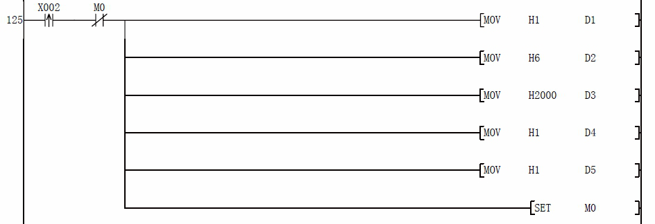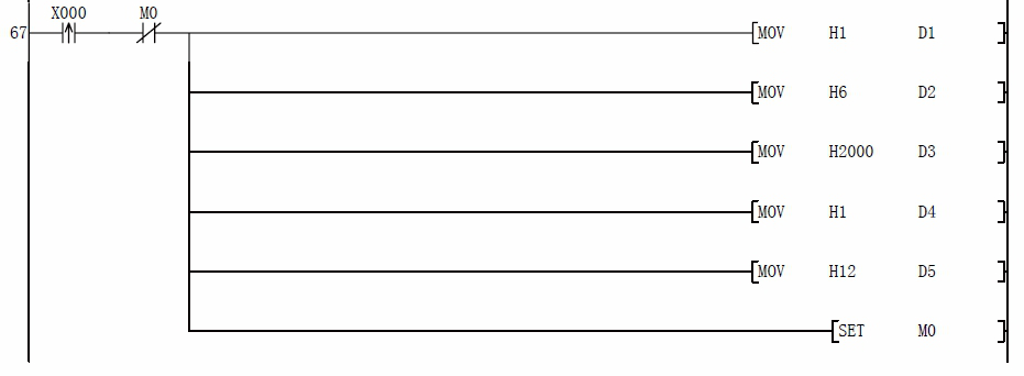 D5:寫頻率寄存器數據,先給 D0 預寫想要的頻率值后,然后按下 X3 即可把預想的頻率寫入變頻器,比如預想寫如 21.22HZ 的話,那么應該首先給 D0 賦值 K2122,然后按下 X3 即可寫入頻率
