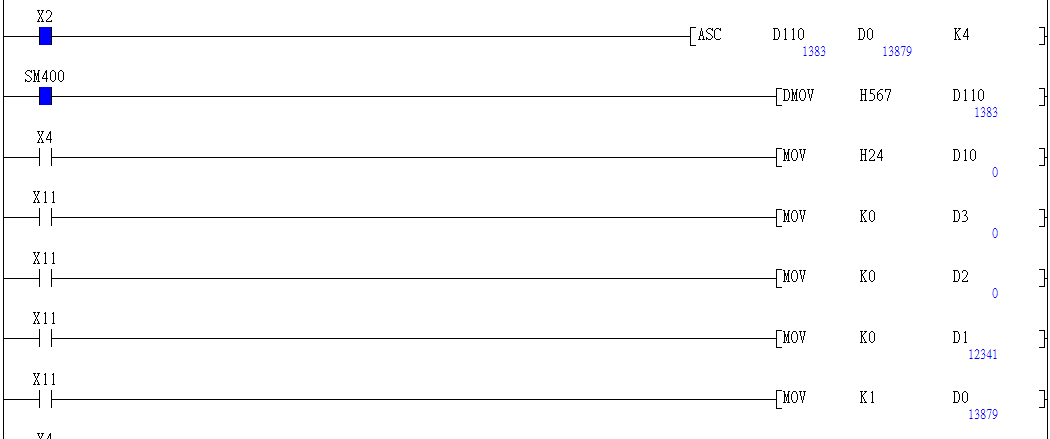 ASC指令:只處理16進(jìn)制數(shù),如圖D110=H567,6和7分別轉(zhuǎn)換成ASC值00110110 00110111當(dāng)做二進(jìn)制存儲在D0中,0011011000110111=13879