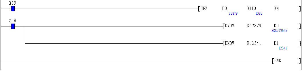 HEX指令:與ASC指令正好相反,K4同樣表示轉(zhuǎn)換幾個(gè)字符串,D0=K13879先轉(zhuǎn)換為二進(jìn)制