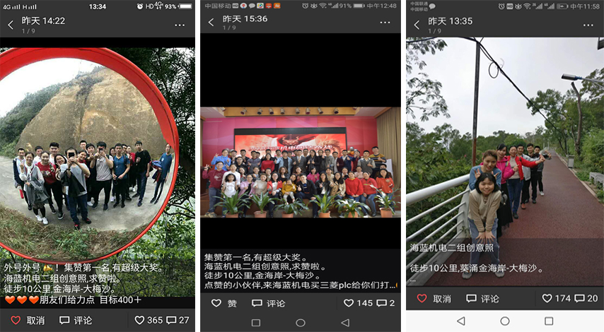 早餐完畢,約摸九點(diǎn)。我們各組便帶上任務(wù)開(kāi)始了徒步之旅,從金海岸徒步至大梅沙食午飯,總程約10公里。大家是不是很好奇,這個(gè)任務(wù)是什么,竟要徒步10公里來(lái)完成,其實(shí)這個(gè)任務(wù)很簡(jiǎn)單,就是徒步過(guò)程中,各組組員一起完成創(chuàng)意拍照,然后前去朋友圈收集點(diǎn)贊,點(diǎn)贊者最多的組可獲得神秘禮品一份(領(lǐng)導(dǎo)為了我們鍛煉身體也是用心良苦了)。于是我們都使出了各種招兒,讓朋友幫自己點(diǎn)贊,甚至不惜群發(fā)騷擾-_- ,這會(huì)我想我應(yīng)該被不少人拉黑了吧。