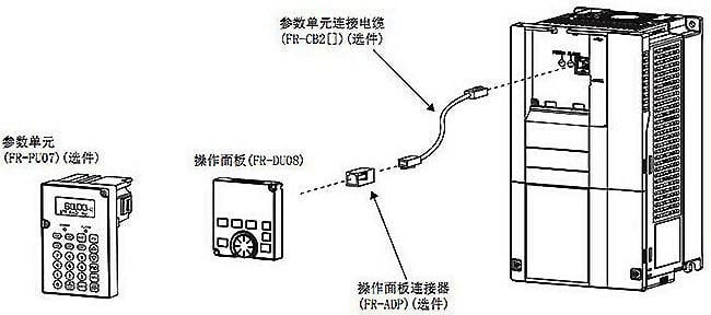 ? 使用電纜將操作面板 (FR-DU08)或參數單元 (FR-PU07)與變頻器連接,可以將操作面板或參數單元安裝于電氣柜表面,